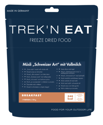 Indispensable on adventure travel and tours in faraway lands for muesli fans is the Trek’n Eat Swiss Muesli with Milk. Switzerland is in fact the birthplace of muesli. Originally, Swiss muesli was served less often as the classic breakfast as it was for a light meal. For example, in its homeland, it was frequently served as an additional delicacy along with the evening meal. And Trek’n Eat’s Swiss Muesli with Milk has everything that characterizes the classic version: apples for a dash of fruit delight, hazelnuts for a complete and wholesome bit of raw crunch. Not just for fans of the Swiss specialty, the Trek’n Eat Swiss Muesli with Milk is well-suited for an ideal breakfast or it can also step up as a simple and satisfying meal when mealtime is better suited for a cold dish.