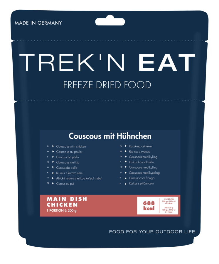 With this delicious meal, the culinary trip this time will take you to the Maghreb. The mouth-watering couscous with chicken is waiting for outdoor fans to gather in a relaxed get-together around the nightly camp fire. As with all other Trek‘n Eat meals, this couscous contains neither added preservatives nor added taste enhancers. The couscous is available in a resealable stand-up pouch with filling line. All Trek’n Eat menus have a shelf life of five years. Trek’n Eat is appreciated by anyone who is looking for easy preparation, authentic taste, low carrying weight, and low fuel consumption during cooking on trips.