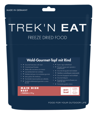 A dish for real gourmets: tasty beef combined with mushrooms and onions. This Trek'n Eat dish is rounded off with noodles, which provide sufficient carbohydrates. The taste experience is simply delicious from the first bite and the dish is highly digestible. It quickly awakens longings for trekking tours through colorful autumn forests or kayaking adventures on lonely lakes. The forest gourmet pot with beef captures the taste of wild nature, no matter where you are.