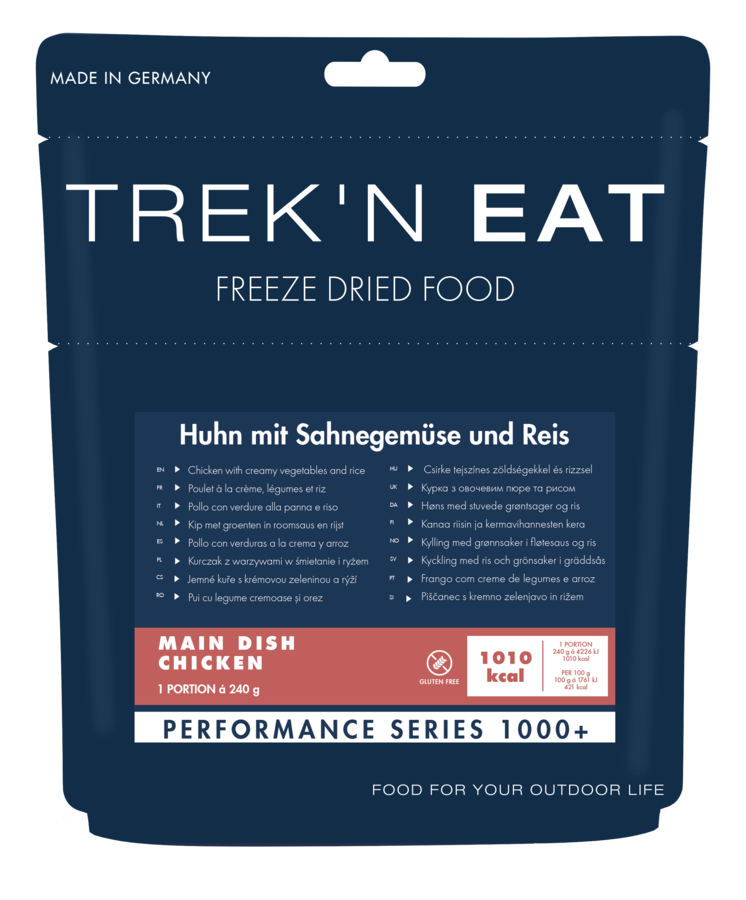 With 1011 kcal, this creamy rice dish also provides the necessary energy for physical exertion in nature and scores with valuable proteins and vitamins. What is called chicken fricassee at home is served up by Trek'n Eat as a delicious meal on the go, conjured up in a few simple steps and providing the body with long-lasting nutrients.
