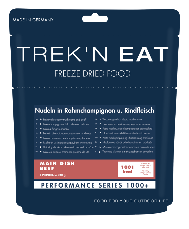Hearty, nutritious and full of energy – this creamy pasta dish is reminiscent of grandma's tasty home cooking and provides a large portion of protein and carbohydrates. The combination of mushrooms, cream and beef is just the thing after a strenuous mountain climb or a challenging trail. Over and above, it tastes almost as good as at grandma’s and guarantees creamy enjoyment down to the last spoonful.