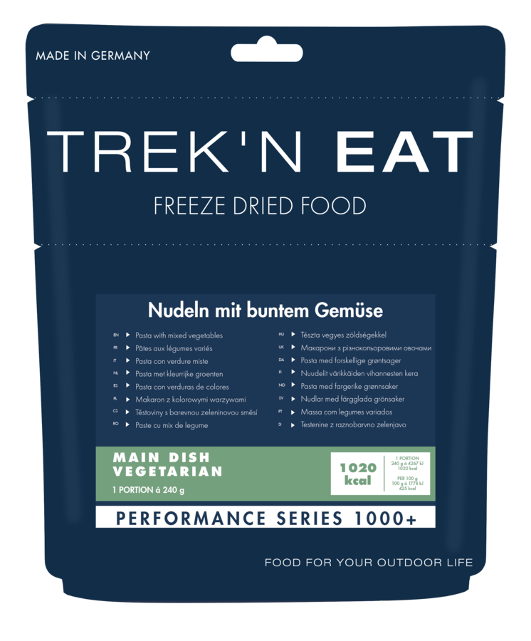 The Trek'n Eat Perfomance Series also has a nutritious dish with 1020 kcal up its sleeve for vegetarian outdoor enthusiasts. The delicious pasta provides the necessary carbohydrates, while a colourful mixture of vegetables provides crunchy vitamins and trace elements. So you can strengthen yourself for the big adventure without meat and get your calories with tasty, high-quality ingredients.
