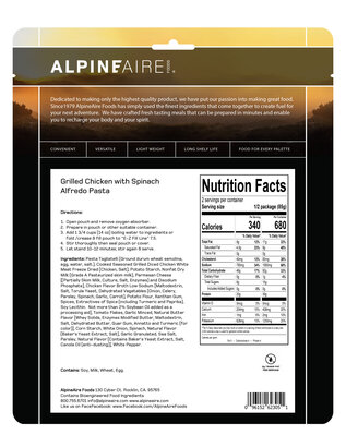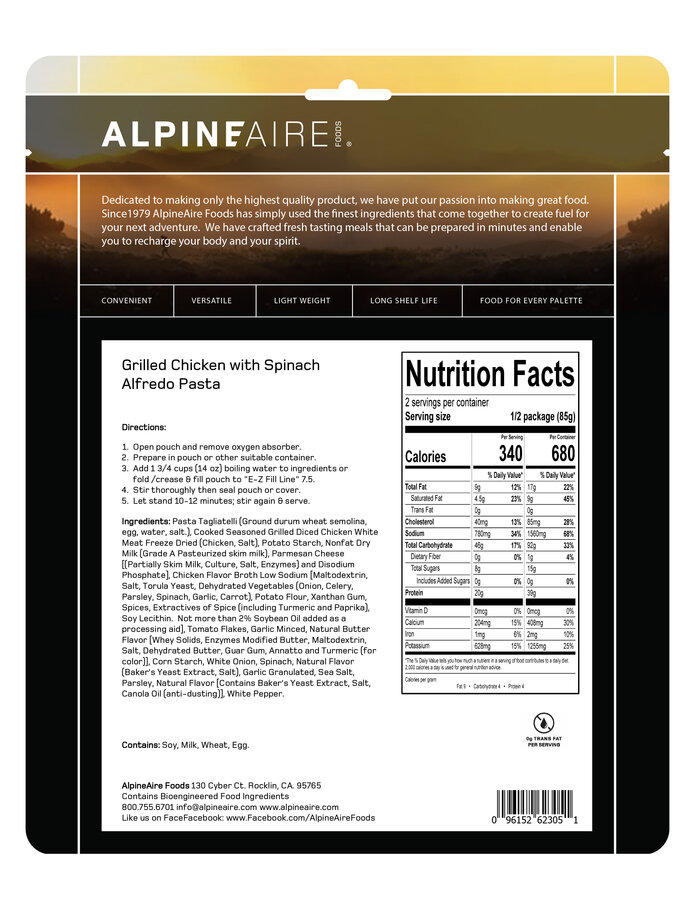 AlpineAire’s grilled chicken really shines in this comfort food classic! Rich, creamy alfredo sauce with spinach, tomatoes, and chicken.