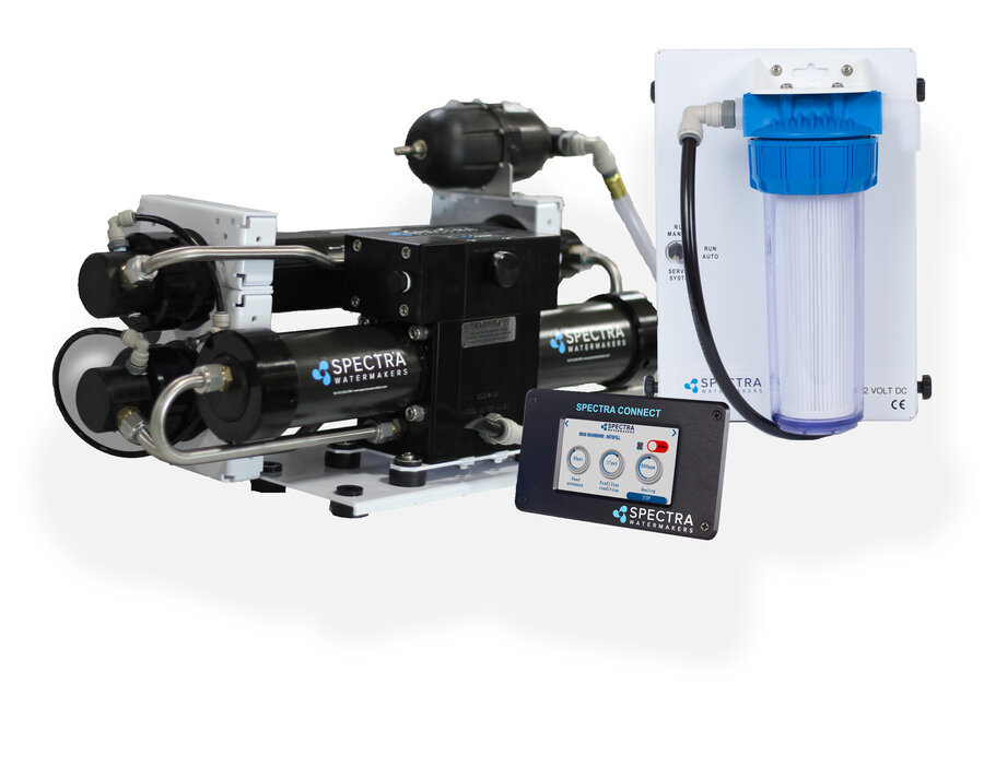 The Catalina 340c Compact produces 14 gallons (53 liters) of water per hour, making it the perfect watermaker for the midsize yacht with two to four people onboard. The Catalina uses the Spectra mag drive feed water pump, making the system extremely quiet, energy-efficient, and reliable. The Spectra Connect allows you to operate and monitor your watermaker from a remote device, and has new added features like the Fill Tank mode, or a customizable Auto Run mode, and One-Touch Sensor Calibration. Now compatible with Garmin, Raymarine, and Simrad Multi-Function Displays (MFD), the watermaker provides even greater control from the helm, for faster, more convenient operations. Two 20” membranes are utilized in the 340c Compact model for maximum space efficiency.