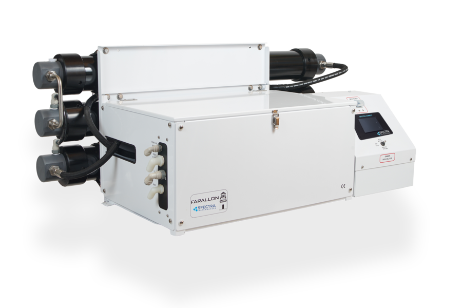 The Farallon systems are designed with Spectra’s unique Pearson Pump technology for unrivaled reliability, energy efficiency and durability. The Spectra Connect allows you to operate and monitor your watermaker from a remote device, and has new added features like the Fill Tank mode, or a customizable Auto Run mode, and One-Touch Sensor Calibration. Now compatible with Garmin, Raymarine, and Navico/Simrad Multi-Function Display (MFD), the watermaker provides even greater control from the helm.The slow-moving pumps mean minimal maintenance intervals, for longer, quieter, and trouble-free operation. The Farallon’s variable frequency drive motor controller ensures soft starts without massive inrush current to crash your generator at startup. Powered by 110v or 220v AC, these systems bring municipal scale desalination plant features to your fingertips.