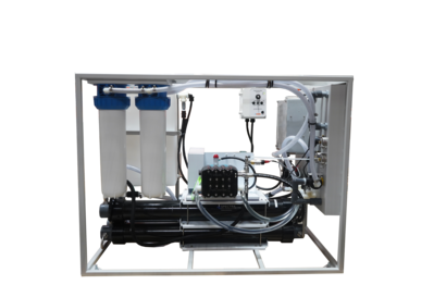 The LB 2800 F is an analog desalination unit that is built using the patented Spectra Pearson Pump™ which allows for energy efficiencies comparable to large scale industrial desalination plants. The LB 2800 F is a turnkey solution producing 120 gallons/hour (444 Liters/hour) of fresh potable water from fresh, brackish or seawater sources. These units are available with an optional custom built pc board controller for fully automated operation. The LB 2800 F systems are completely integrated into a stainless steel frame and factory tested to rigid performance specification.The Pearson Pump™ is a breakthrough in pump design, combining a high-pressure piston pump with built-in energy recovery. The energy normally wasted in the high-pressure brine stream is recovered, saving up to 75% of the power required for a standard reverse osmosis system. The Pearson Pump’s™ “hydraulically locked” recovery rate allows the system to produce the full rated volume of water from virtually any water source, without the user making any changes to the system. Standard systems require operator adjustments as the pressure changes, but our fixed recovery rate system eliminates the need for operator input and prevents membrane damage.The LB 2800 F is contained within a rugged 304 powder coated stainless steel frame, pre-plumbed and tested with all components. It includes is a built-in permeate flush tank which doubles as a clean in place tank by simply turning the service valves.All landbased systems require a low pressure feed pump (not included) based on your site specific requirements. Depending on the quality of the feed water available on your site media filters may be also be required to allow the prefilters to last for a reasonable amount of time.