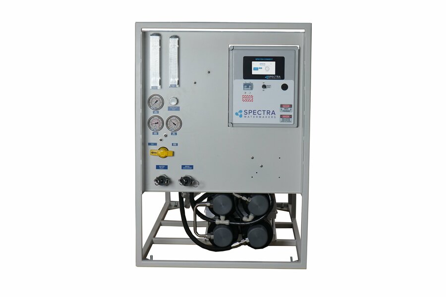 The LB 4000 F is an analog desalination unit that is built using the patented Spectra Pearson Pump™ which allows for energy efficiencies comparable to large scale industrial desalination plants. The LB 4000 F is a turnkey solution producing 180 gallons/hour (1260 Liters/hour) of fresh potable water from fresh or up to 25,000 ppm salinity brackish water sources.These units are available with an optional custom built pc board controller for fully automated operation. The LB 4000 F systems are completely integrated into a stainless steel frame and factory tested to rigid performance specification.The Pearson Pump™ is a breakthrough in pump design, combining a high-pressure piston pump with built-in energy recovery. The energy normally wasted in the high-pressure brine stream is recovered, saving up to 75% of the power required for a standard reverse osmosis system. The Pearson Pump’s™ “hydraulically locked” recovery rate allows the system to produce the full rated volume of water from virtually any water source, without the user making any changes to the system. Standard systems require operator adjustments as the pressure changes, but our fixed recovery rate system eliminates the need for operator input and prevents membrane damage.The LB 4000 F is contained within a rugged 304 powder coated stainless steel frame, pre-plumbed and tested with all components. It includes is a built-in permeate flush tank which doubles as a clean in place tank by simply turning the service valves.All landbased systems need a low pressure feed pump (not included) based on your site specific requirements. Depending on the quality of the feed water available on your site media filters may be also be required to allow the prefilters to last for a reasonable amount of time.