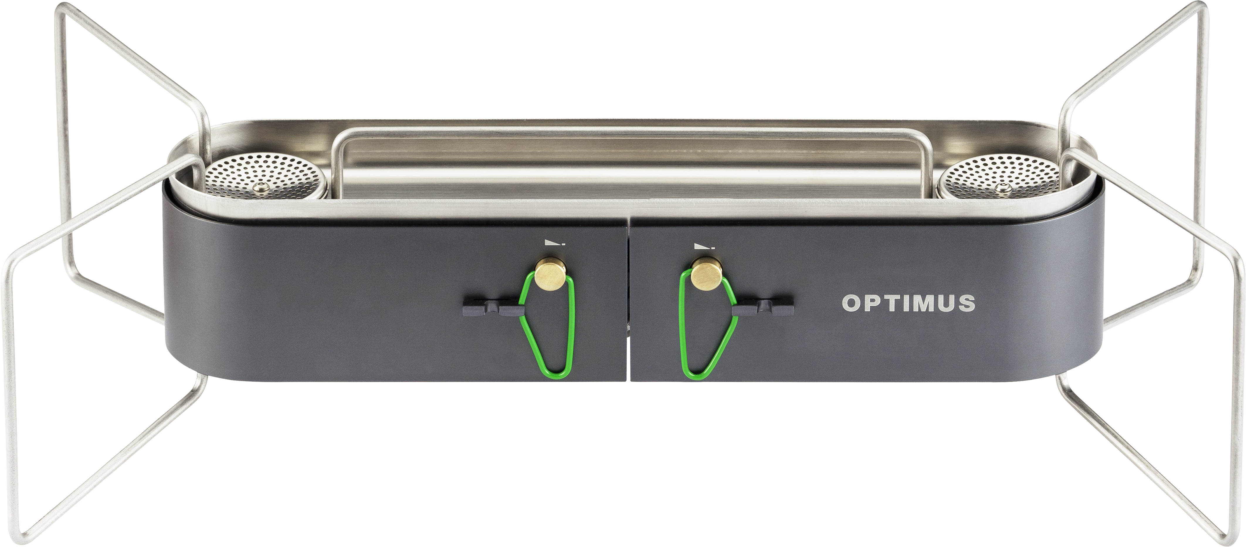 The Optimus Gemini double burner stove has a gas regulator inside the body of the unit. An internal part of the gas regulator component may have a burr that may wear or tear a hole in the seal, causing gas to leak out of the back of the regulator, posing a fire hazard.